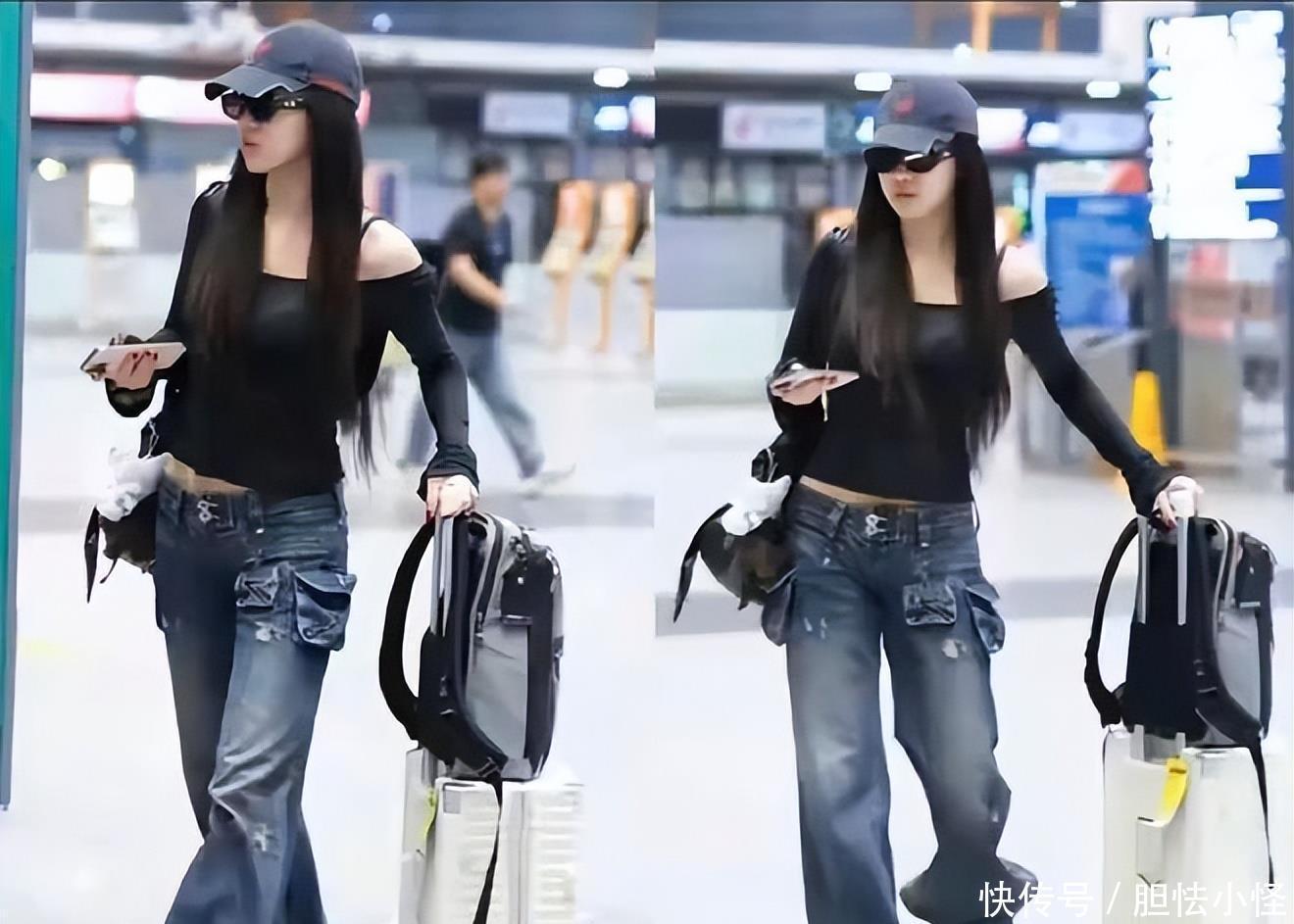 玄色露肩上衣配牛仔裤,打扮的天然有些松弛然则显得很可人。